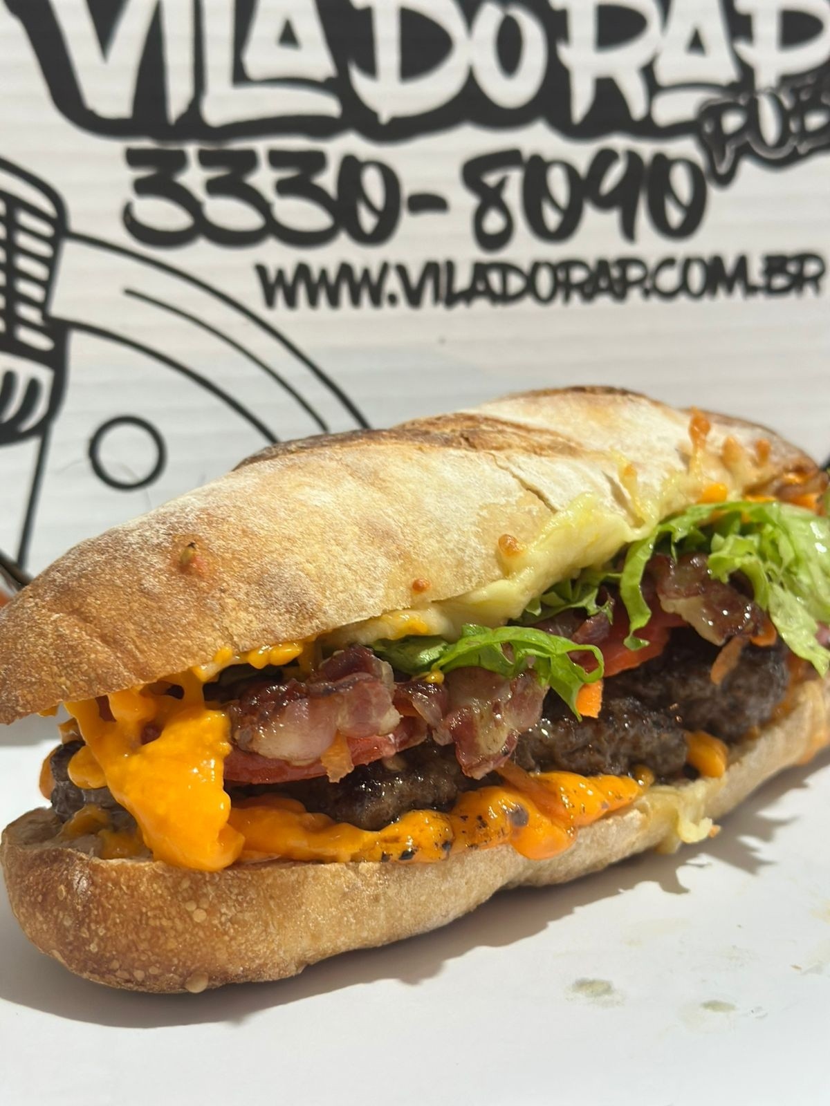 Pão Italiano artesanal, Hambúrguer artesanal 180g, Tiras de bacon, Cenoura ralada, Tomate, Alface, queijo mussarela, Molho Barbecue